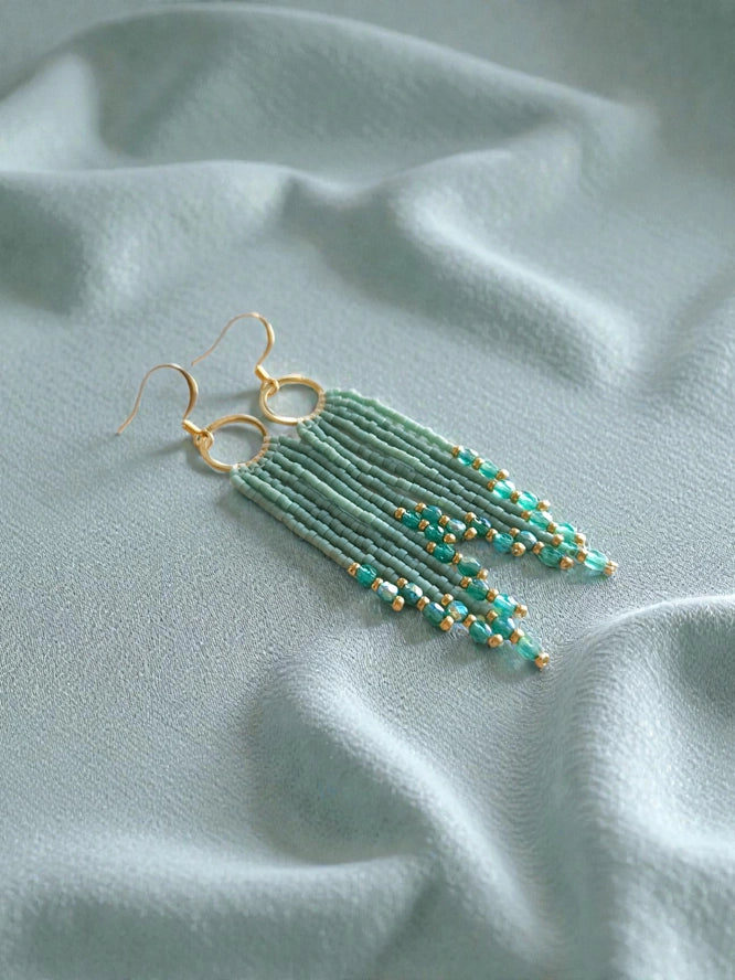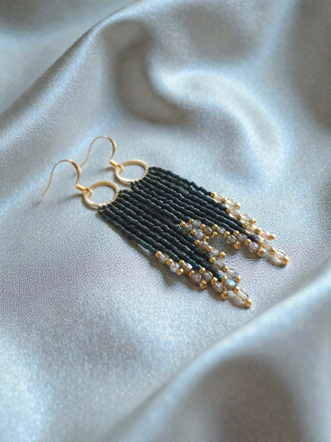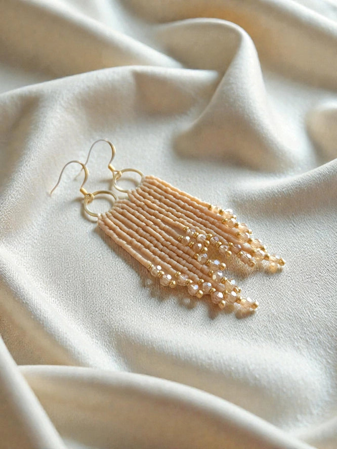 Elevate your everyday style with Lucie Beaded Skinny Fringe Earrings—handmade with precision-cut Japanese Miyuki Delica seed beads and sparkling crystal accents.