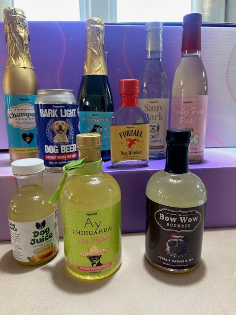 For "Yappy Hour" we will have a doggy bar with drinks like "Bark Light" dog beer (coconut water for dogs), "Furball Dog Whiskey" (pumpkin water for dogs), "Champaws Dog Champagne" &" Sauv Bark Dog Wine"
